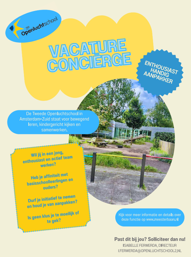 Kijk en klik op deze link voor meer informatie; Vacature Conciërge – Tweede Openluchtschool voor het Gezonde Kind – Amsterdam